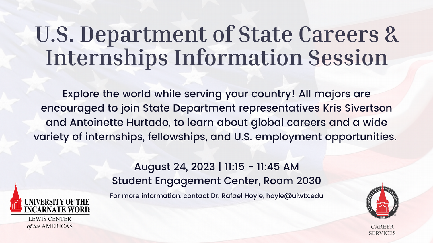 Explore the world while serving your country during the U.S. Department of State Careers & Internships Information Session with State Department representatives Kris Sivertson and Antoinette Hurtado.